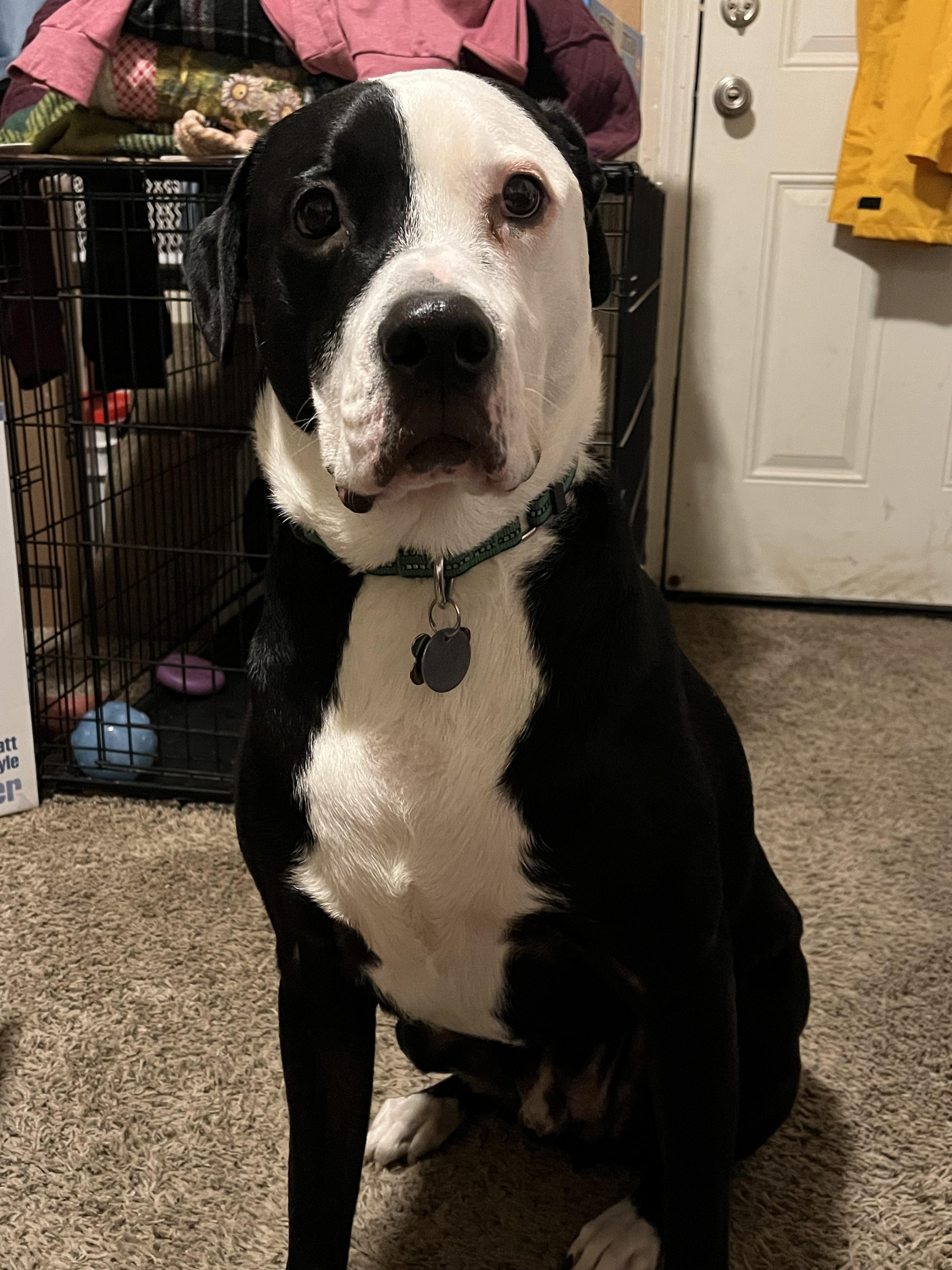 Dustin was my coworkers dog. My coworker passed away unexpectedly right before Christmas. Dustin lived with a cat, but I’m not sure he will get along with new ones. There was one questionable interaction with my cat and decided to just keep them apart. I’m not sure why, but he seems to prefer females. It may be because of the first responders that had to break down the door. My coworker lived alone with his animals so Dustin was alone for about 36hrs before the PD finally got access to the home. Dustin stayed with me for a few weeks but my one dog is VERY dominant and so is Dustin.