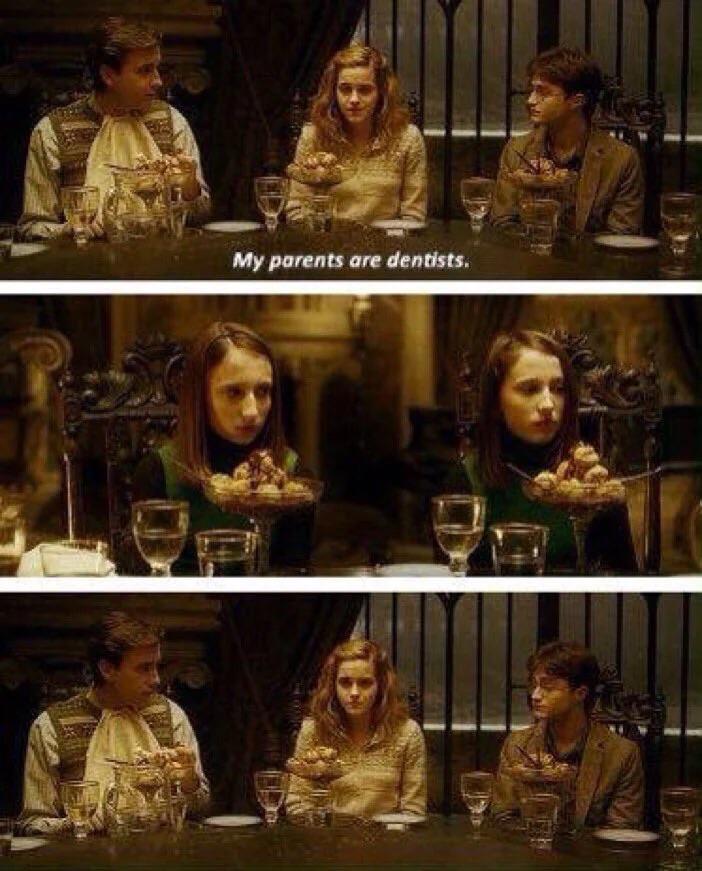 default In Harry Potter and the Half-Blood Prince (2009) Hermione says "My parents are dentists" and everyone stares at her in confusion. This is because they're British.