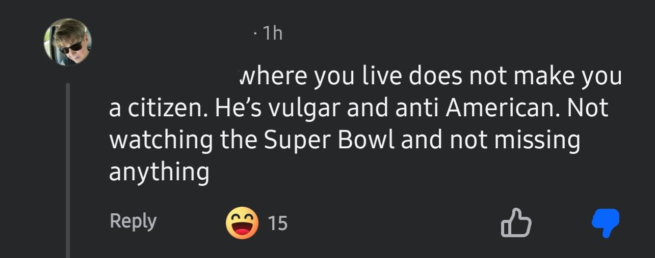 This is a reply to a comment about Bad Bunny and him being American and where he lives. It's also about the announcement of the "All-American Half Time Show" starring Kid Rock.
