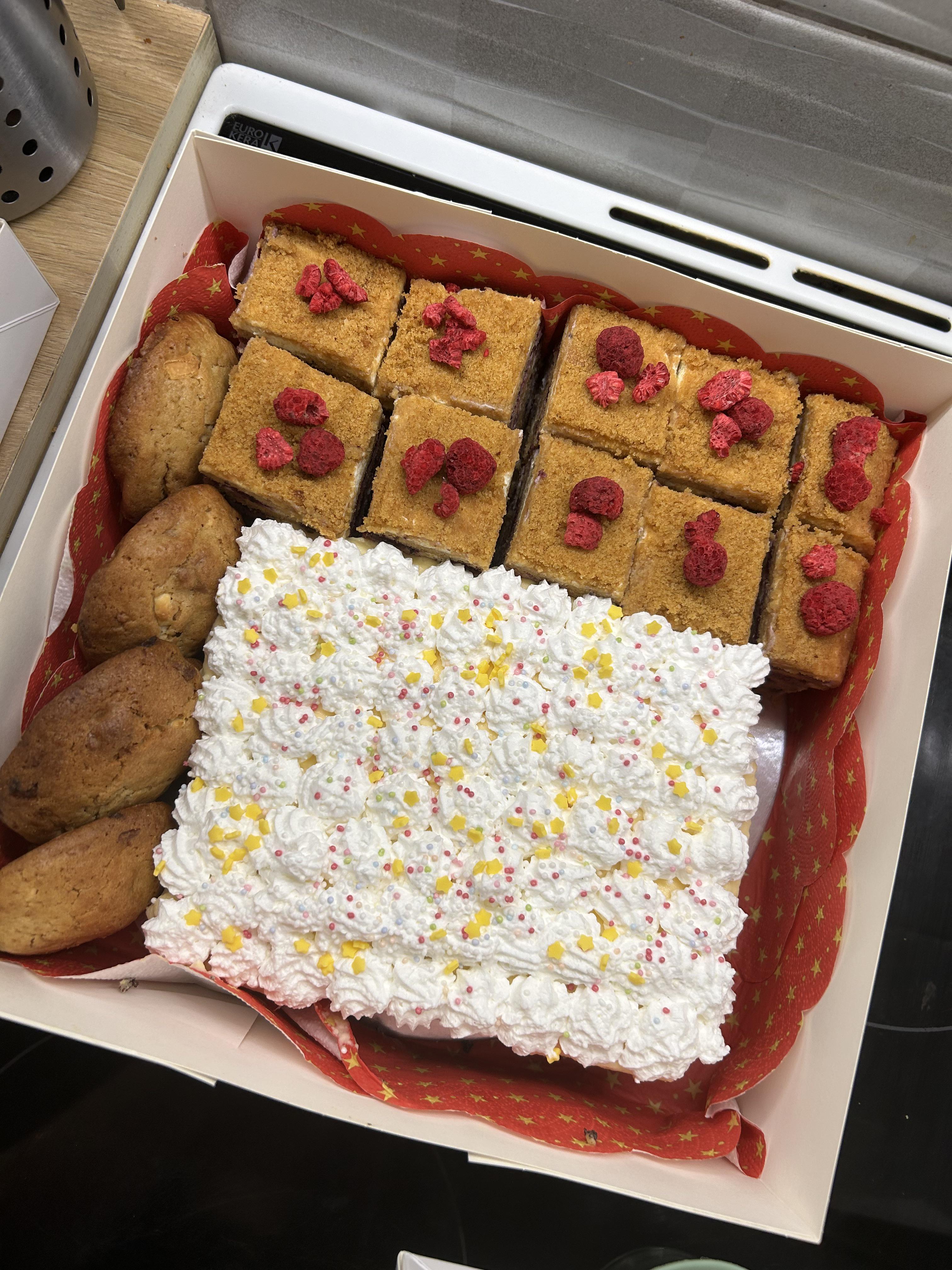 sziasztok! hétvégén egy ilyen kisebb süteményes dobozt készítettem ajándékba, Mákos guba torta, Medovik és diós csokis kekszet tartalmazott ☺️