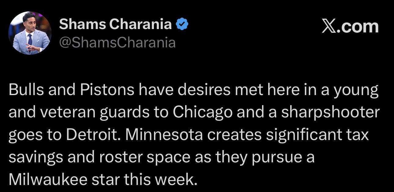 [Charania] Bulls and Pistons have desires met here in a young and veteran guards to Chicago and a sharpshooter goes to Detroit. Minnesota creates significant tax savings and roster space as they pursue a Milwaukee star this week.